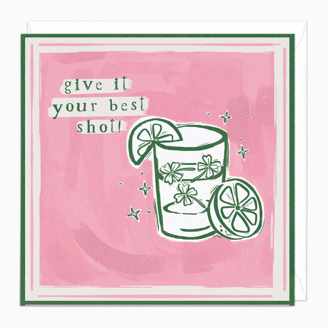 A rosy wash of colour and a playful cocktail illustration set the mood for celebration. Perfect for wishing someone luck, courage and confidence as they raise a glass to new beginnings.
